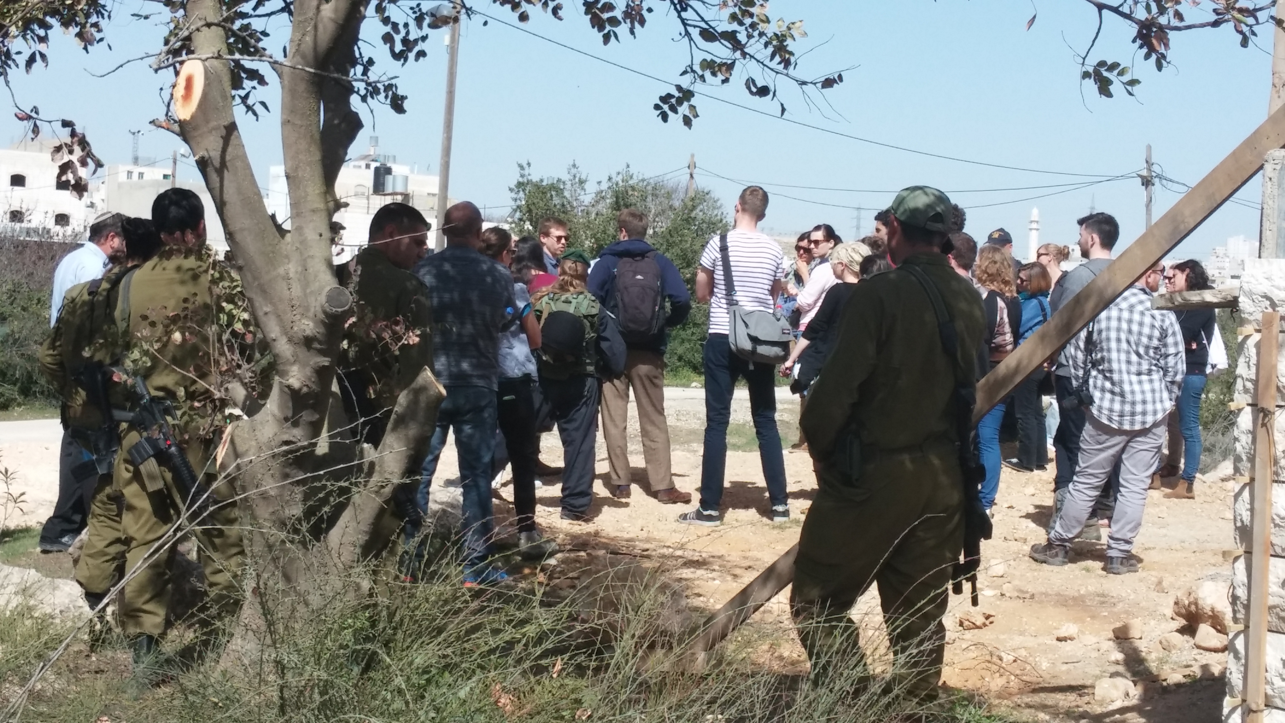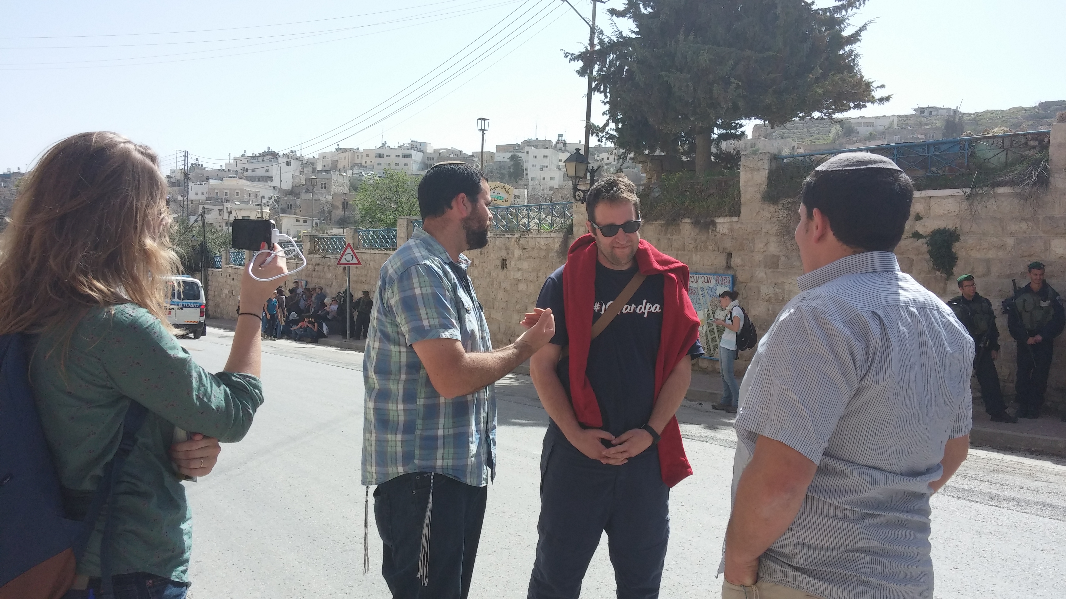 אל הקבוצה מתלווים ארבעה אנשי מג"ב, "אתם תהיו מאחורה, אנחנו מקדימה", מחלק אותם מפקד הכח. את הליווי הצבאי מנצל נדב ביגלמן, מדריך הסיור, להפנות אצבע מאשימה. "כוחות הביטחון פה מגנים עלינו לא מפני הפלסטינים אלא מפני המתנחלים", הוא מבהיר. "בשבוע שעבר הם הצליחו לבטל לנו סיור ברגע האחרון, ובעצם דחו אותו להשבוע, אז הבאנו הרבה אנשים". המחזה של כוחות ביטחון יעצים את התחושות שנדב מנסה להעביר למאזינים. שוב ושוב הוא משתף את הקהל בחוויות שלו כחייל בגדוד 50 של הנח"ל, ששירת בחברון ב-2008. המעשים שעשה כחייל, לטענתו בעלות מטרה אחת בלבד – ליצור תחושת שליטה באוכלוסייה אזרחית, "ליצור תחושת נרדפות".