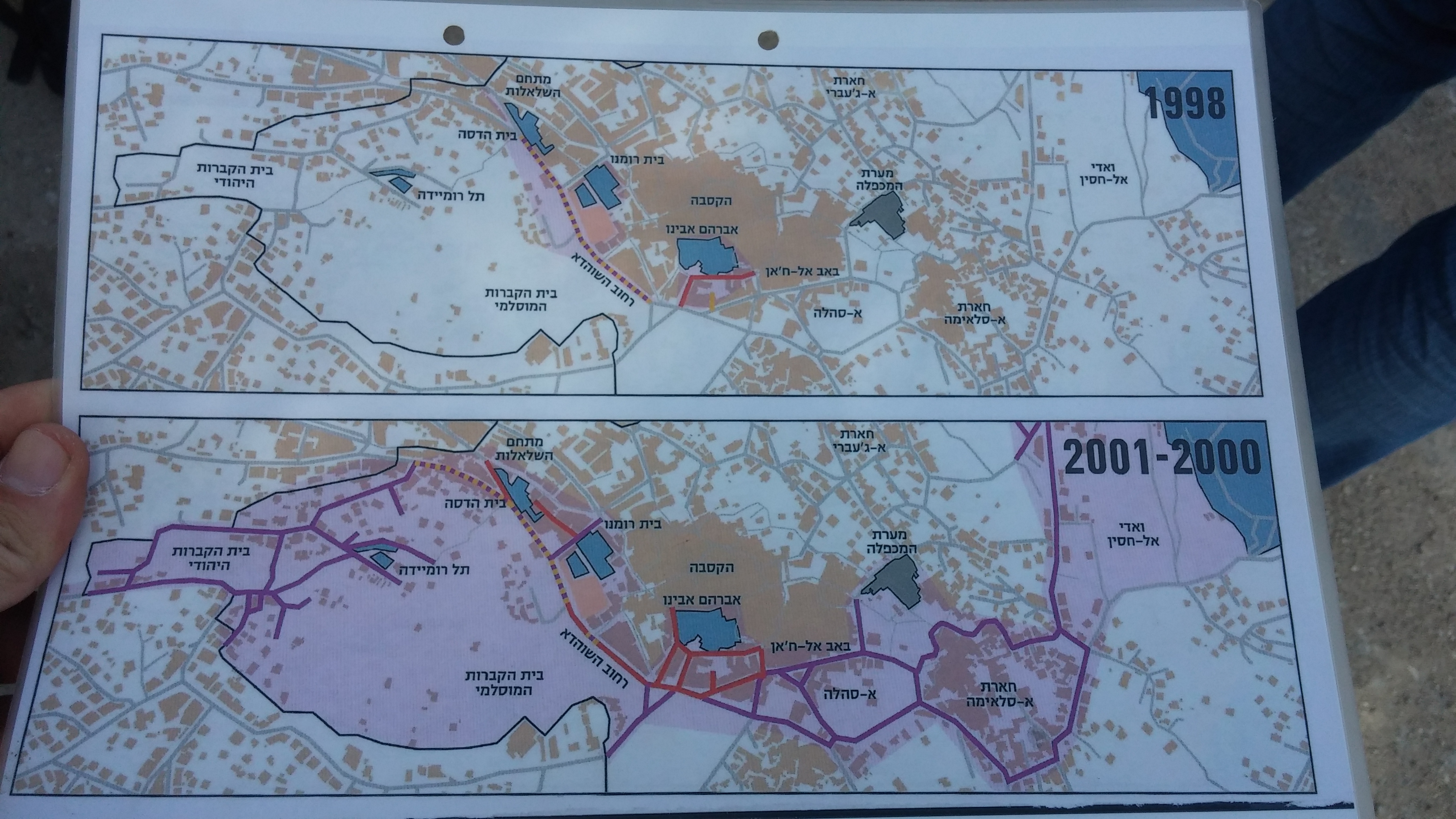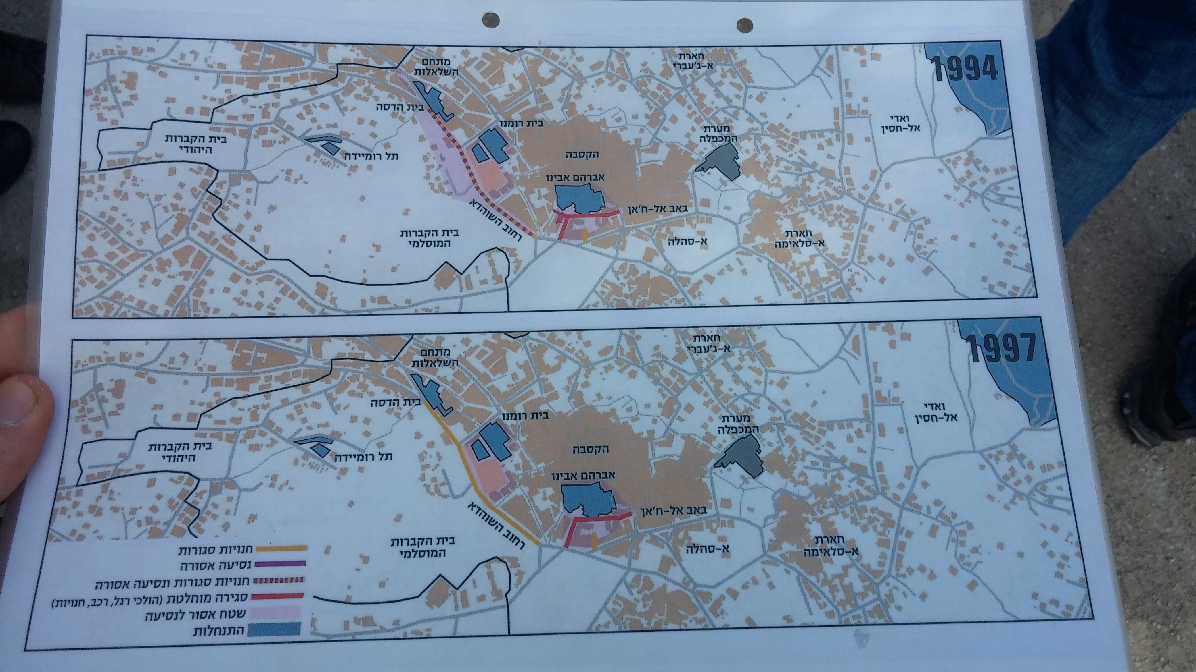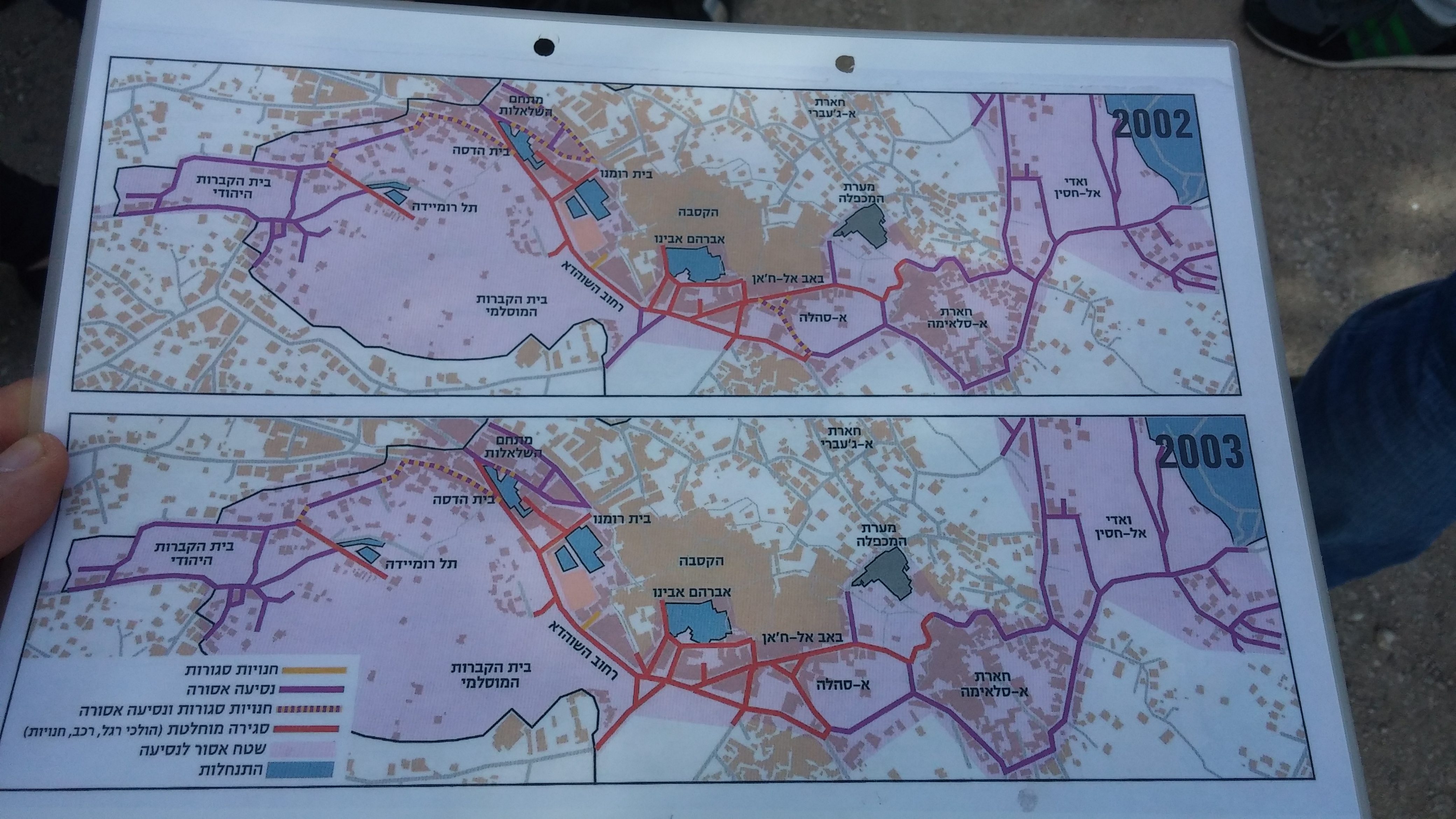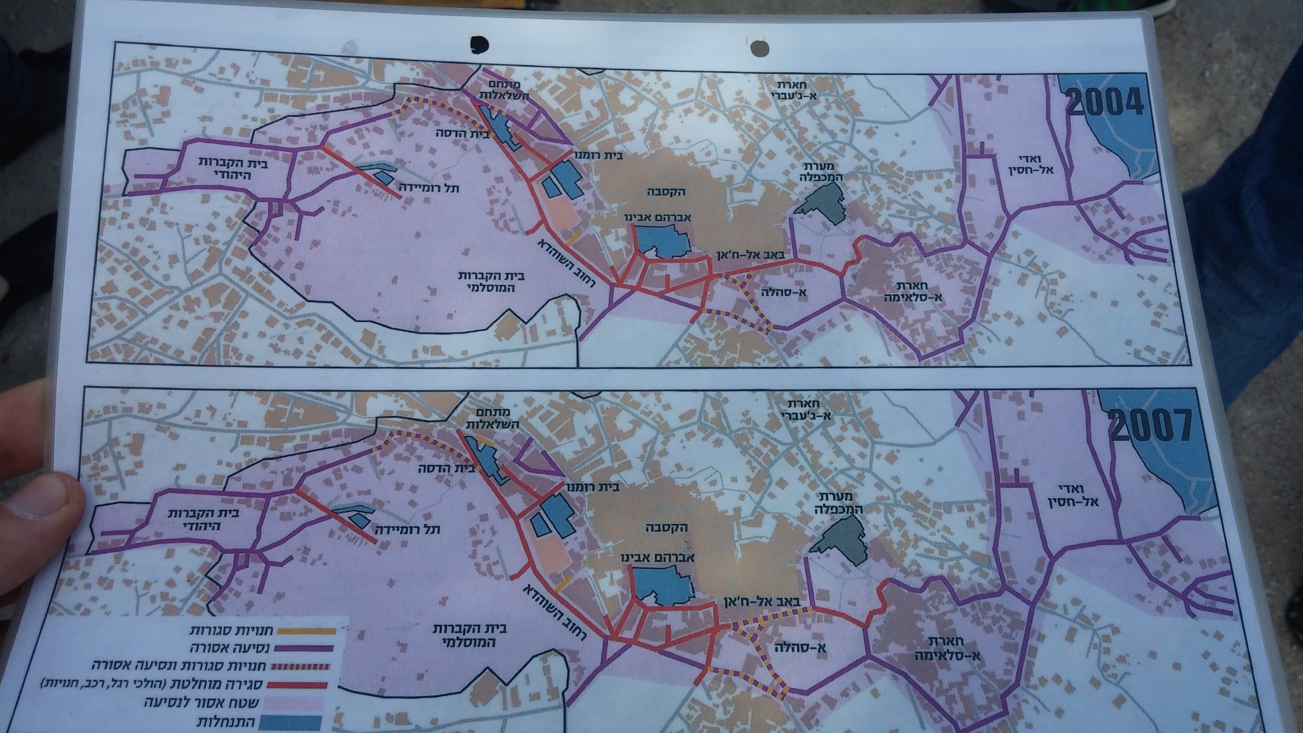 הסיור נע ונד סביב רחוב עמק חברון, ובפי המדריך ה'שוהדא'. ביגלמן מגולל את הסיפור בפני המאזינים, איך פעם הרחוב שקק חיים ומאז האינתיפאדה אט אט הוא נסגר. הוא מחלק מפות של 'בצלם' לכל הקבוצה, בה מסומנות הדרכים, עם חלוקה לצבעים. אדום – אסור למעבר פלסטינים, סגול אסור למעבר יהודים, צהוב-סגול אומר שאסור לפתוח חנויות או לעבור עם רכבים, אבל המעבר מותר לכולם. מטרת ההפרדה היא "למנוע חיכוך, לשמור על הביטחון, מה שתמיד יבוא על חשבון הפלסטינים".