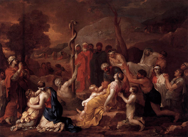 וַיָּבֹא הָעָם אֶל משֶׁה וַיֹּאמְרוּ חָטָאנוּ כִּי דִבַּרְנוּ בַיהֹוָה וָבָךְ הִתְפַּלֵּל אֶל יְהֹוָה וְיָסֵר מֵעָלֵינוּ אֶת הַנָּחָשׁ וַיִּתְפַּלֵּל משֶׁה בְּעַד הָעָם: וַיֹּאמֶר יְהֹוָה אֶל משֶׁה עֲשֵׂה לְךָ שָׂרָף וְשִׂים אֹתוֹ עַל נֵס וְהָיָה כָּל הַנָּשׁוּךְ וְרָאָה אֹתוֹ וָחָי: וַיַּעַשׂ משֶׁה נְחַשׁ נְחשֶׁת וַיְשִׂמֵהוּ עַל הַנֵּס וְהָיָה אִם נָשַׁךְ הַנָּחָשׁ אֶת אִישׁ וְהִבִּיט אֶל נְחַשׁ הַנְּחשֶׁת וָחָי: